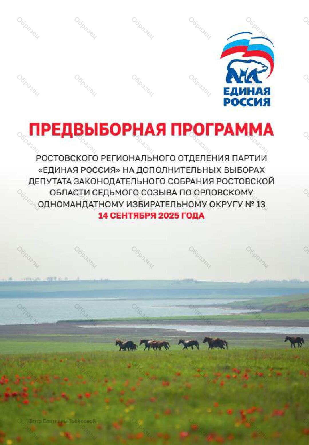 | Наименование агитационного материала | Предвыборная программа Ростовского регионального отделения партии "ЕДИНАЯ РОССИЯ" на дополнительных выборах депутата Законодательного Собрания Ростовской области по Орловскому одномандатному округу №13 |