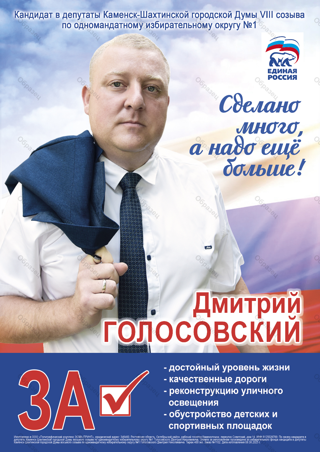 Оплата за изготовление произведена из избирательного фонда кандидата в депутаты Каменск-Шахтинской городской Думы восьмого созыва по одномандатному избирательному округу №1 Голосовского Дмитрия Николаевича