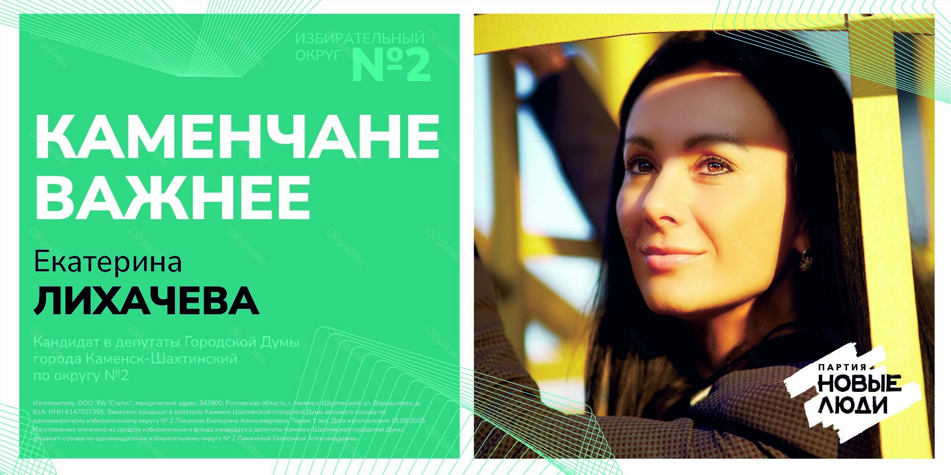Оплата за изготовление произведена из избирательного фонда кандидата в депутаты Каменск-Шахтинской городской Думы восьмого созыва по одномандатному избирательному округу № 2 Лихачевой Екатериной Александровной