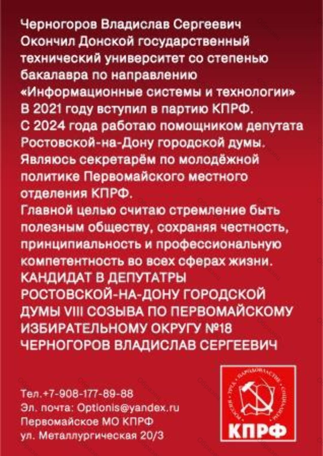 | Субъект выдвижения (кем выдвинут) | "КОММУНИСТИЧЕСКАЯ ПАРТИЯ РОССИЙСКОЙ ФЕДЕРАЦИИ" |