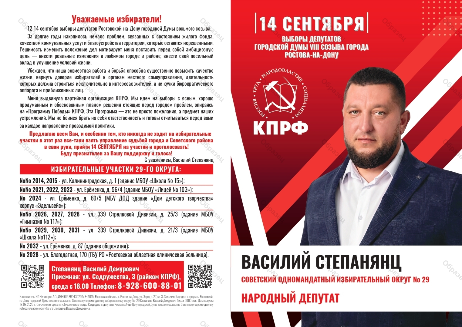 Оплачено из средств избирательного фонда кандидата в депутаты Ростовской-на-Дону городской Думы восьмого созыва по Советскому одномандатному избирательному округу № 29 Степанянц Василий Демурович