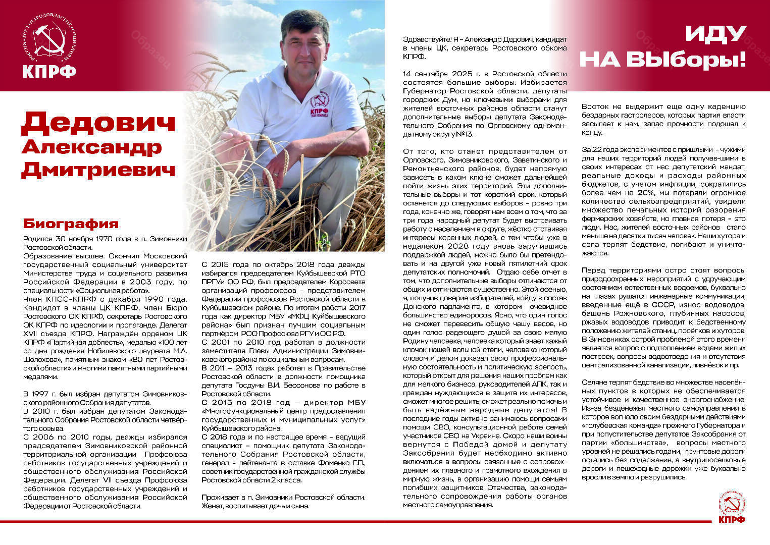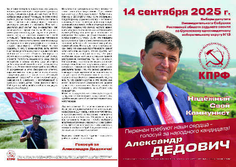 Оплачено из средств избирательного фонда кандидата в депутаты Законодательного Собрания Ростовской области седьмого созыва по Орловскому одномандатному избирательному округу № 13 Дедовича Александра Дмитриевича