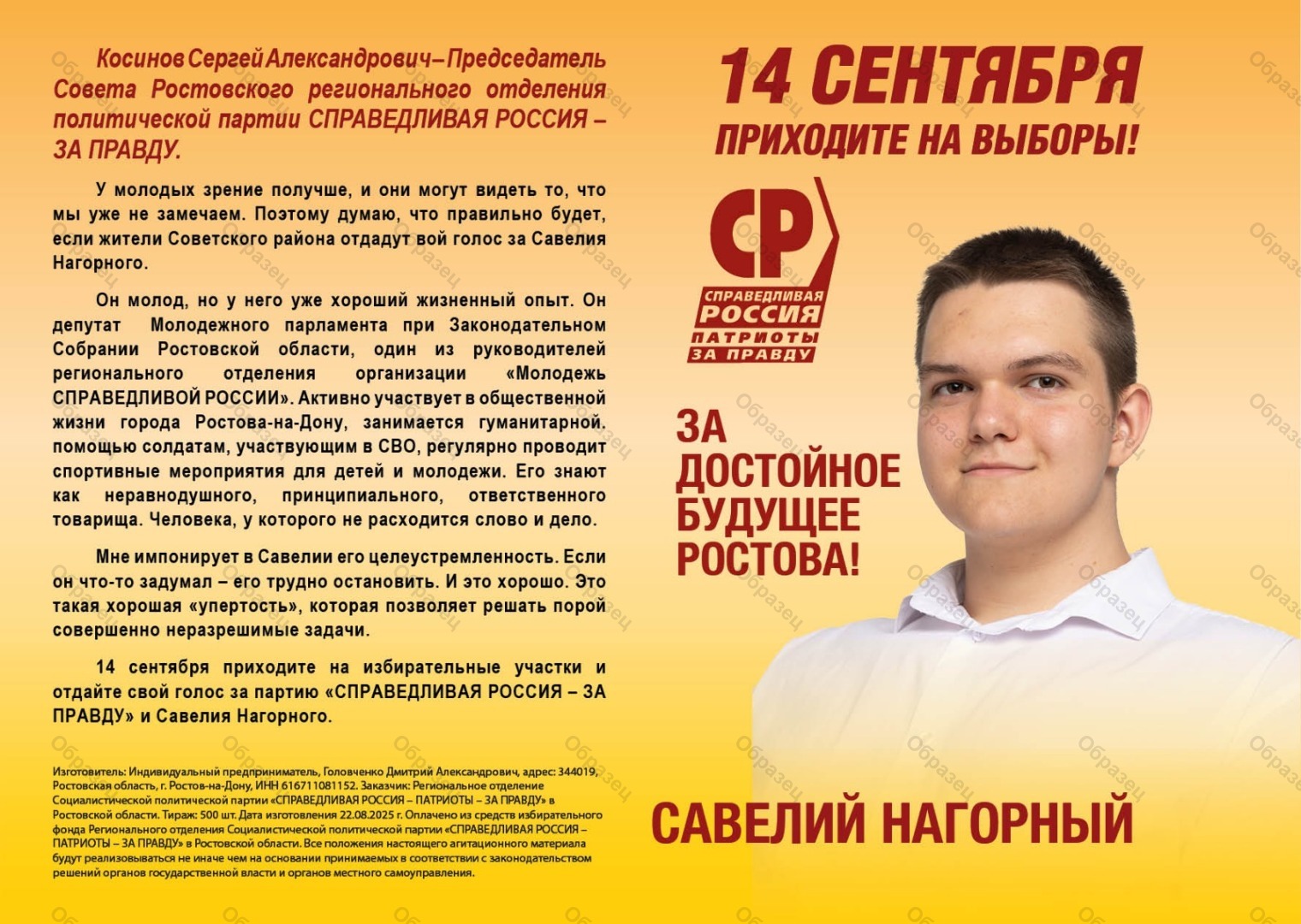 Оплачено из средств избирательного фонда Регионального отделения Социалистической политической партии «СПРАВЕДЛИВАЯ РОССИЯ – ПАТРИОТЫ – ЗА ПРАВДУ» в Ростовской области
