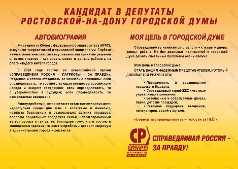| Субъект выдвижения (кем выдвинут) | Региональное отделение Социалистической политической партии "СПРАВЕДЛИВАЯ РОССИЯ - ПАТРИОТЫ - ЗА ПРАВДУ" в Ростовской области |