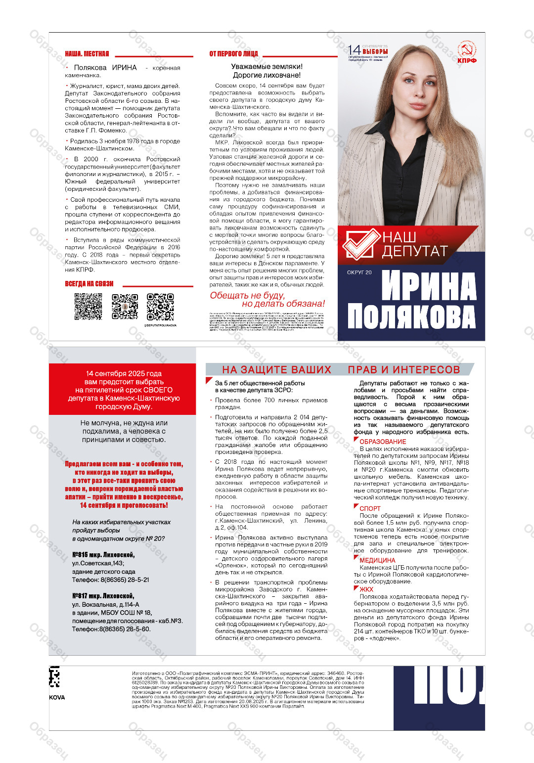 По заказу кандидата в депутаты Каменск-Шахтинской городской Думы восьмого созыва по одномандатному избирательному округу №20 Поляковой Ирины Викторовны
