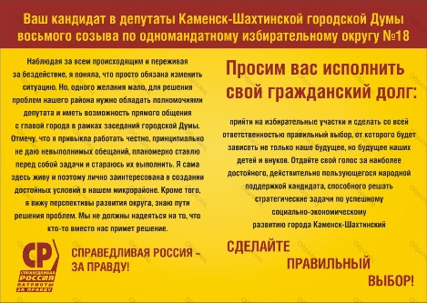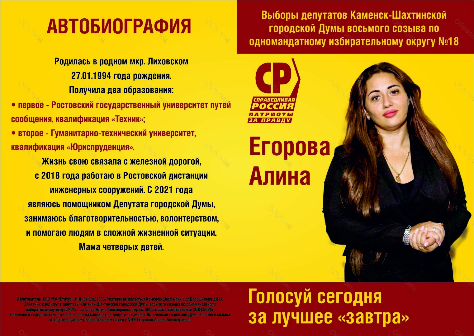 По заказу кандидата в депутаты Каменск-Шахтинской городской Думы восьмого созыва по одномандатному избирательному округу № 18 Егоровой Алины Алекберовны