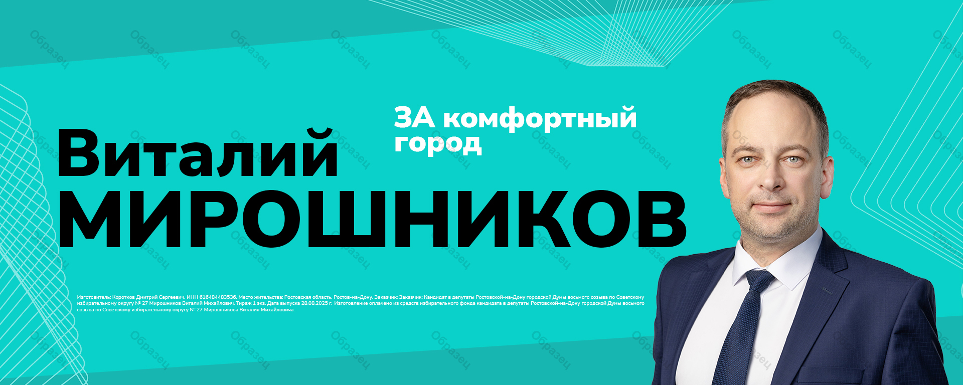 Оплачено из средств избирательного фонда кандидата в депутаты Ростовской-на-Дону городской Думы восьмого созыва по Советскому одномандатному избирательному округу № 27 Мирошникова Виталия Михайловича