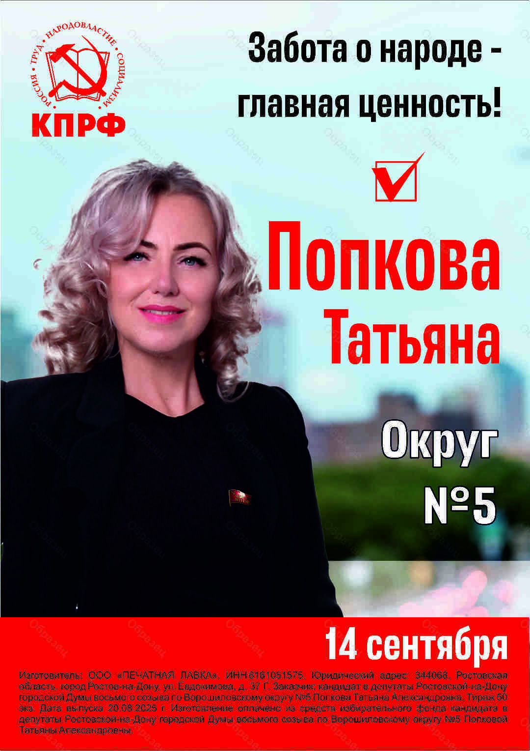 Изготовление оплачено из средств избирательного фонда кандидата в депутаты Ростовской-на-Дону городской Думы восьмого созыва по Ворошиловскому округу №5 Попковой Татьяны Александровны