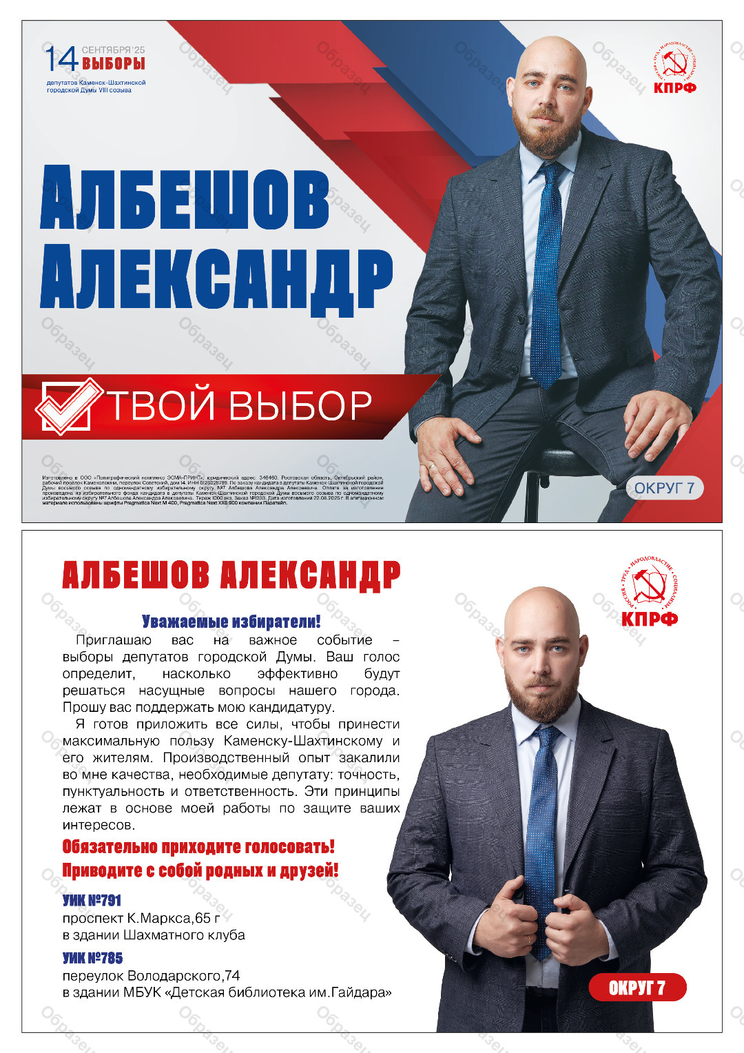 По заказу кандидата в депутаты Каменск-Шахтинской городской Думы восьмого созыва по одномандатному избирательному округу № 7 Албешова Александра Алексеевича