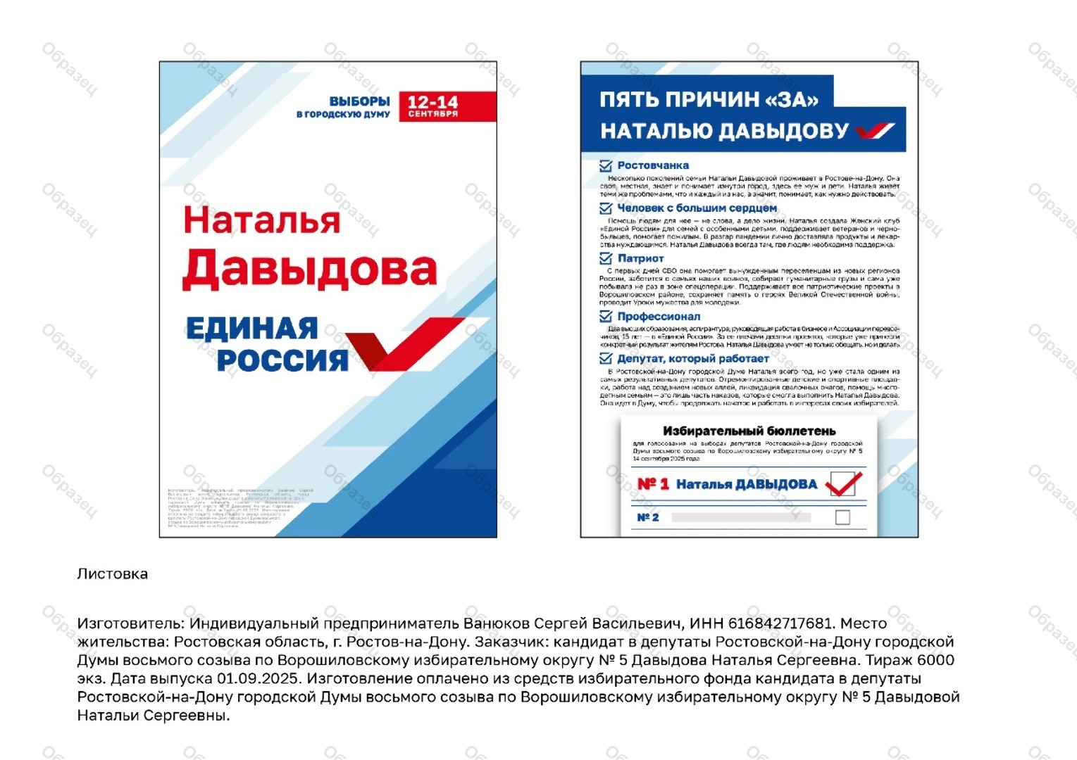 Изготовление оплачено из средств избирательного фонда кандидата в депутаты Ростовской-на-Дону городской Думы восьмого созыва по Ворошиловскому избирательному округу № 5 Давыдовой Натальи Сергеевны