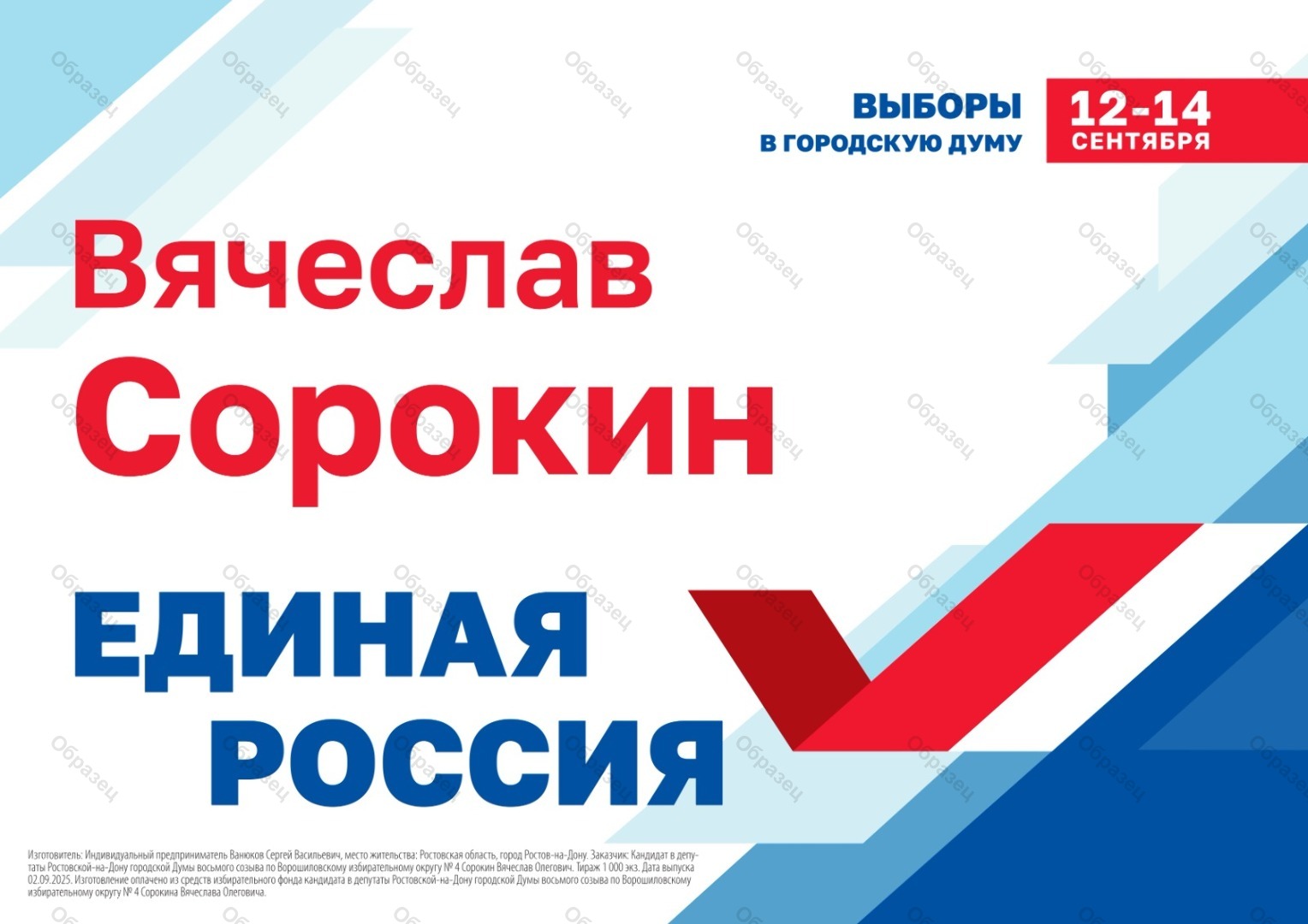 Изготовление оплачено из средств избирательного фонда кандидата в депутаты Ростовской-на-Дону городской Думы восьмого созыва по Ворошиловскому избирательному округу № 4 Сорокина Вячеслава Олеговича