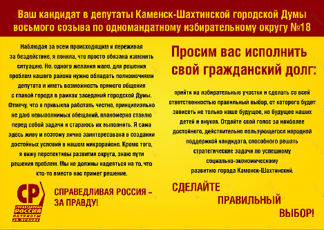 По заказу кандидата в депутаты Каменск-Шахтинской городской Думы восьмого созыва по одномандатному избирательному округу № 18 Егоровой Алины Алекберовны